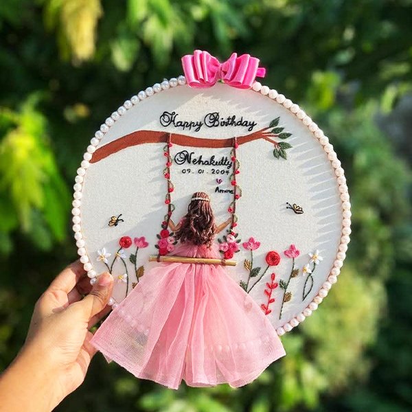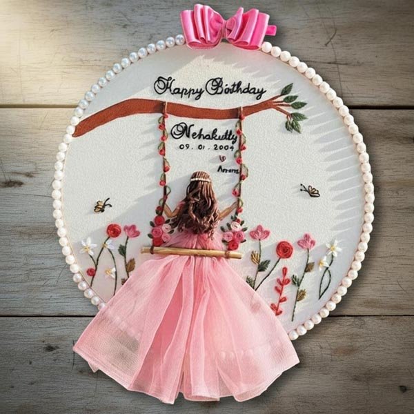 Personalized 3D Embroidered Birthday Hoop Art – Swinging Girl in Pink Tulle Dress – Custom Date & Name Gift