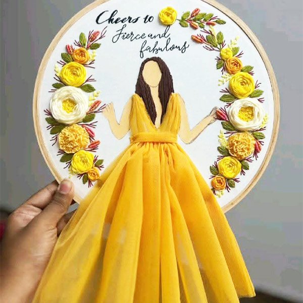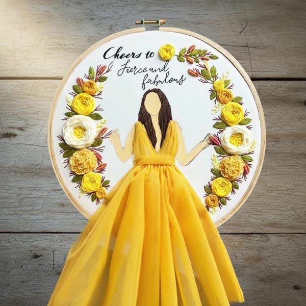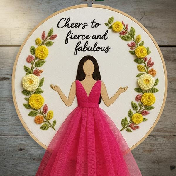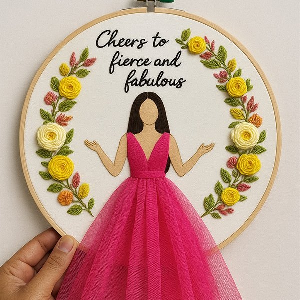 “Cheers to Fierce and Fabulous” 3D Embroidery Hoop Art – Girl in Pink Tulle Dress